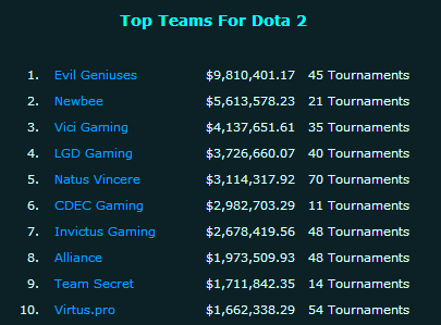 Самой успешной командой является Evil Geniuses – около десяти миллионов долларов клуб заработал в дисциплине Dota 2. Почти в два раза меньше выигранных призовых имеет организация Newbee. В десяток самых богатых команд попали и 2 коллектива из СНГ –