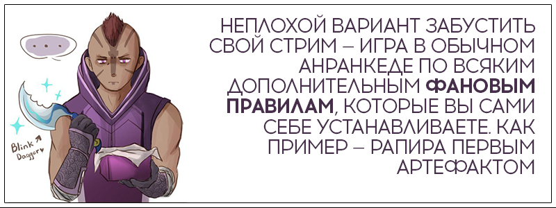 Ещё один неплохой вариант забустить свой стрим — игра в обычном анранкеде по всяким дополнительным фановым правилам, которые Вы сами себе устанавливаете. Как пример — рапира первым артефактом или запрет на хил у фонтана. Если поразмышлять над этим подольше, то можно придумать очень интересные сценарии, которые принесут немало рофлов и Вам, и Вашим зрителям, особенно, если играть в пати, да со скайпом. ;)