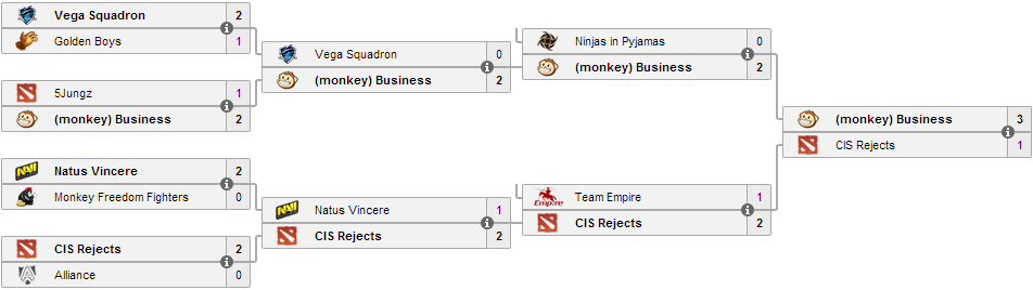 По итогу матча зрителей и фанатов из СНГ ждало разочарование: победу в финальном сражении одержала команда Monkey Business, которой удалось 3 карты завершить в свою пользу (матч проходил в формате best-of-5). CIS Rejects, с другой стороны, лишь одну игру смогли записать в свой актив. Таким образом, Monkey Business выиграли у новоиспеченного коллектива из СНГ со счетом 3-1 и стали победителями европейской квалификации MLG World Finals. Игроки этой команды, следовательно, получили право участвовать в LAN-финалах чемпионата, подробнее о которых вы можете прочитать ниже.