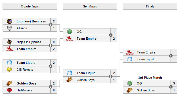 Team Empire. Первые 4 коллектива из этого списка вылетели еще в первом раунде соревнований, потерпев поражение от своих соперников. Поскольку турнир проводился по системе single elimination, такой роскошью, как право на ошибку, участники не обладали.