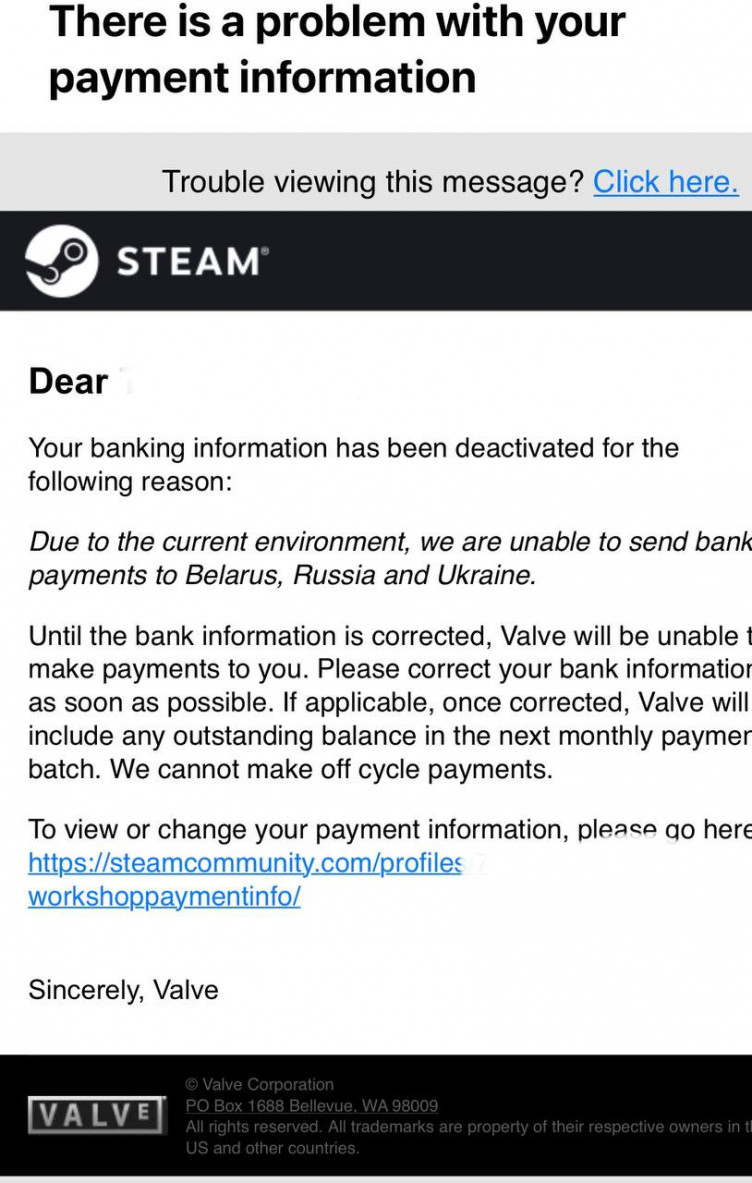 В письме, которое пришло всем авторам, пишут, что, мол, в связи с ситуацией, Valve не может делать банковские платежи в эти страны.