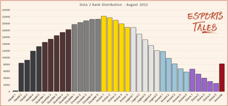 Портал Esportstales опубликовал распределение игроков по рангам в Dota 2 по результатам анализа более четырех миллионов профилей. Выяснилось, что только 13% игроков в Доту имеют ранг выше «Властелина 1».