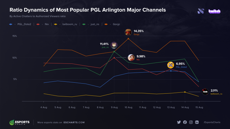 На каналах Nix, NS и ТраВоМаН суммарно почти 18% от всех уникальных авторизованных пользователей активно общались в чате во время игр мейджора. Статистику предоставил аналитический портал Esports Charts.