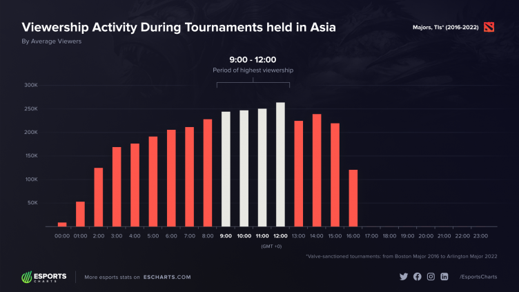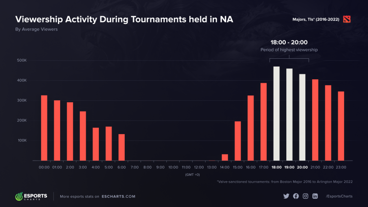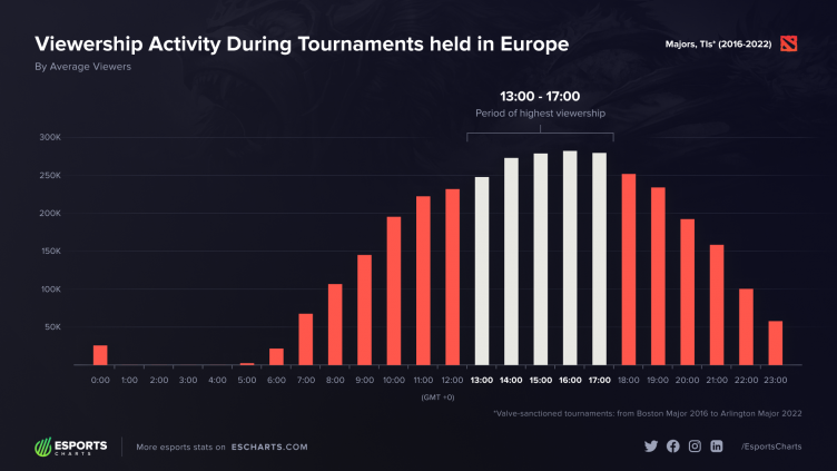 Пики зрительской активности на европейских турнирах попадают в часовую рамку с 13:00 до 17:00 GMT, после чего начинается постепенный отток аудитории. Это может быть связано с тем, что из-за часовых поясов сокращается число зрителей из Азии, в то время как фанаты из Северной Америки не так часто смотрят матчи по утрам и приходят поздним вечером. При этом абсолютно «мертвым» можно назвать промежуток в период с 01:00 до 04:00 GMT — в это время трансляций не было вовсе.