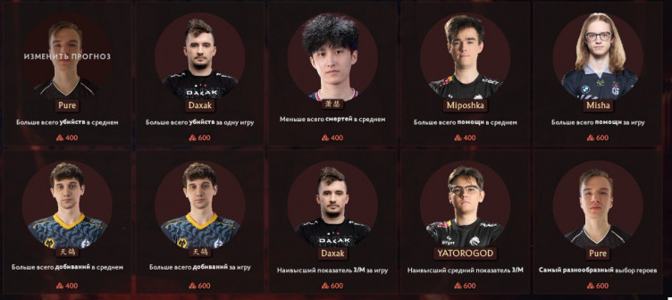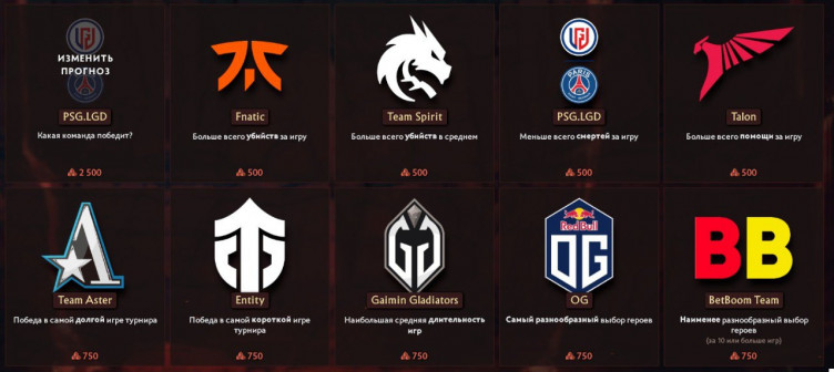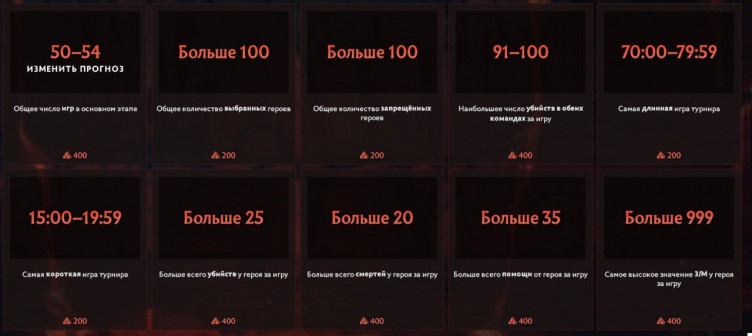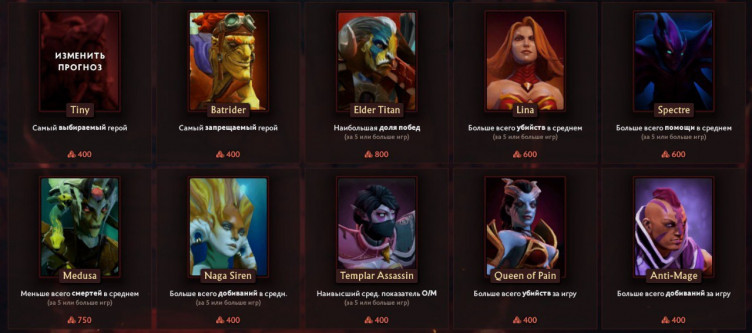 Владельцы Battle Pass 2022 могут сделать прогнозы на общие результаты (по героям и прочим показателям), а также предсказать лучшие показатели среди команд и игроков. За верные прогнозы можно получить от 200 до 800 очков для Боевого пропуска.