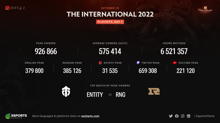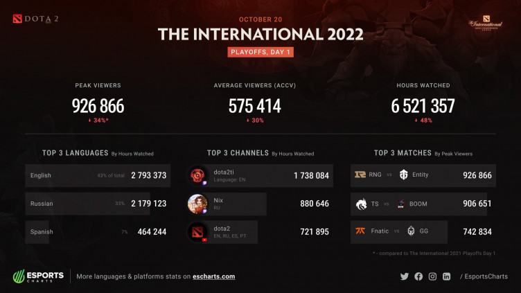 Аналитический портал Esports Charts опубликовал подробную статистику просмотров первого игрового дня основной стадии The International 2022. Пиковое количество зрителей достигло отметки в 926 тысяч человек (385 тысяч следили за турниром на русскоязычных трансляциях), а самым популярным матчем дня стал поединок между