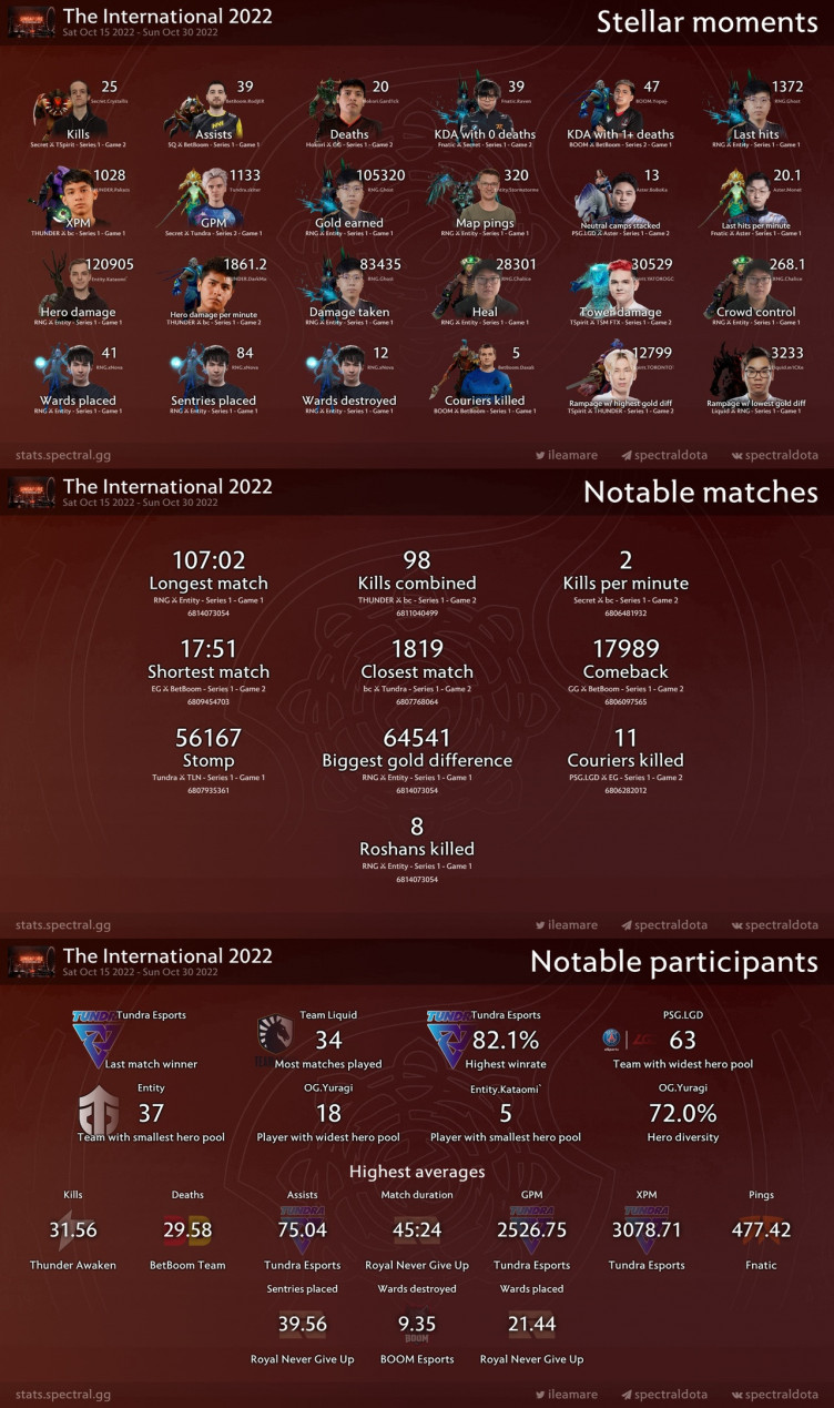 Илья «Leamare» Силаков-Волынский поделился статистикой по итогам сингапурского The International 2022. Средняя продолжительность игр на турнире составила 39 минут и 9 секунд. Участники чемпионата сделали шесть Rampage, установили 8 547 вардов и убили 556 Рошанов.