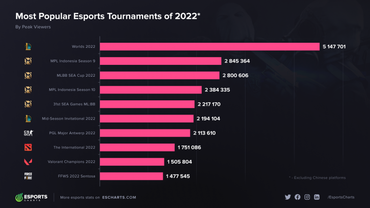 Если сравнивать турниры по пиковому количеству зрителей, The International 2022 теряет еще один пункт в рейтинге и опускается на восьмое место с показателем в 1.7 млн человек. Worlds 2022 в пике смотрели более пяти миллионов зрителей. Статистику предоставил аналитический портал Esports Charts.