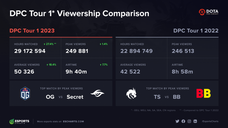 Суммарное время просмотра первого тура Dota Pro Circuit 2023 (в первом дивизионе) достигло отметки в 29 миллионов часов – это на 27% больше по сравнению с первым туром предыдущего сезона DPC. Онлайн на трансляциях также вырос: среднее количество зрителей увеличилось на 18%, а пиковое – на полтора процента.
