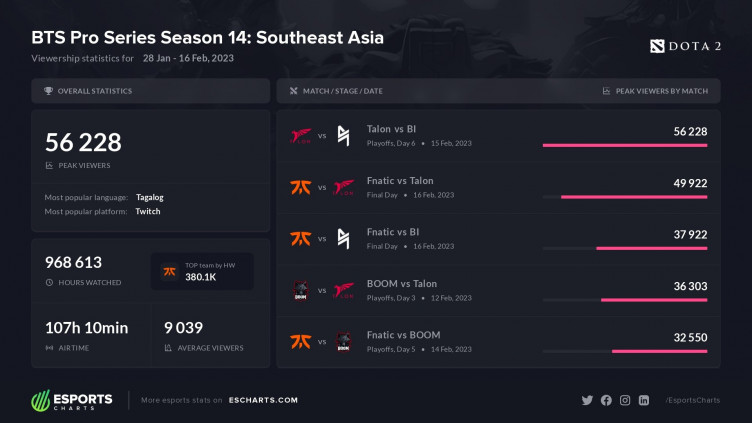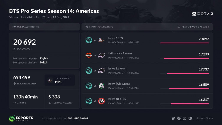 Аналитический портал Esports Charts опубликовал итоговую статистику просмотров четырнадцатого сезона BTS Pro Series. Поединок между