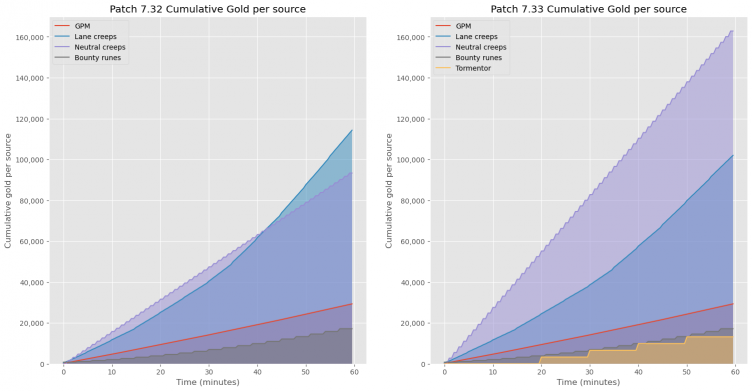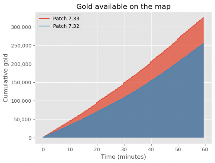 Пользователь Reddit с ником Steinner подсчитал, как изменилось суммарное количество золота на карте в новом патче 7.33 в Dota 2. Выяснилось, что общий объем золота вырос на 29-37% в зависимости от длительности матча. При этом львиная доля этого золота теперь находится не на линиях, а в лесу.