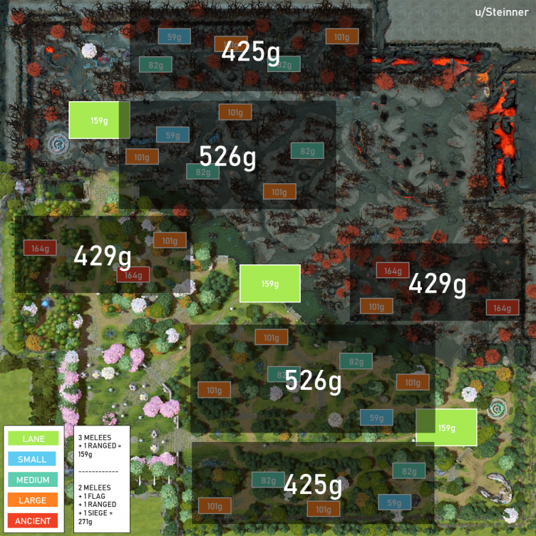 Автор также подсчитал награду за каждый лагерь нейтральных крипов. Каждую минуту в лесу можно получить 2760 золота – это почти на 75% больше, чем в предыдущей версии игры.