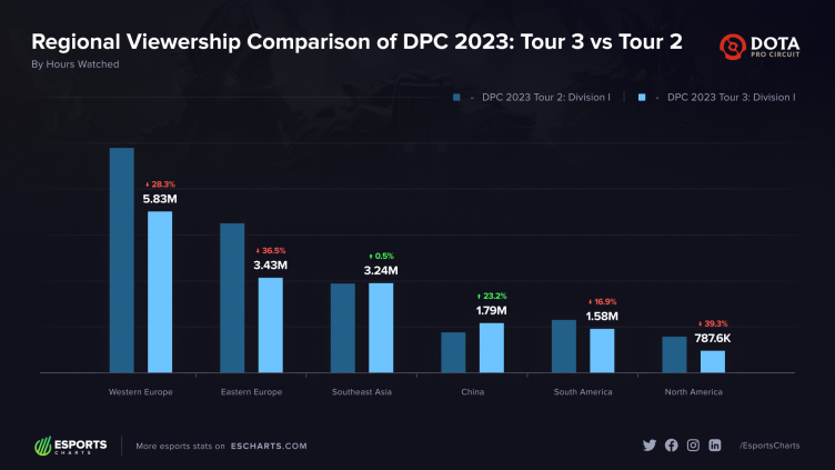 Летний тур Dota Pro Circuit 2023 набрал в совокупности 16.6 млн часов просмотра (речь идет о первом дивизионе) – это на 22% ниже, чем просмотры весенний региональных лиг. Показатели упали во всех регионах, кроме Юго-Восточной Азии и Китая. Статистику предоставил аналитический портал Esports Charts.
