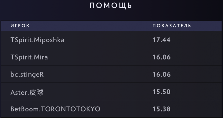 По среднему количеству ассистов за игру среди всех участников турнира лидируют саппорты Team Spirit