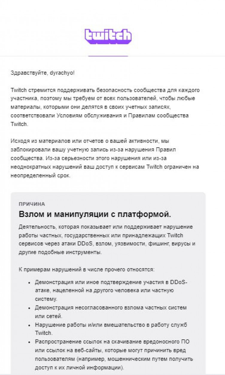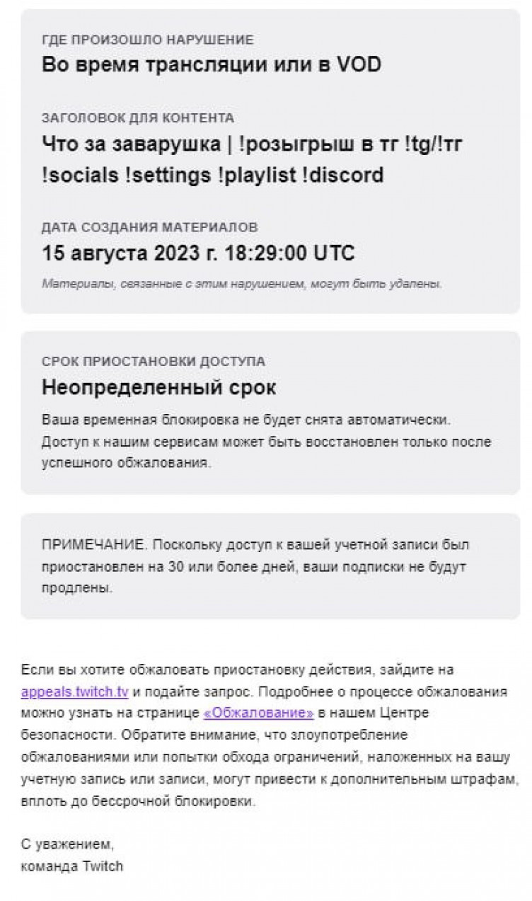 Как следует из письма, полученного российском киберспортсменом от администрации Twitch, канал заблокировали на неопределенный срок за нарушение от 15 августа. Однако Шкредов подал апелляцию, и через несколько часов бан сняли, обнулив при этом количество подписчиков.