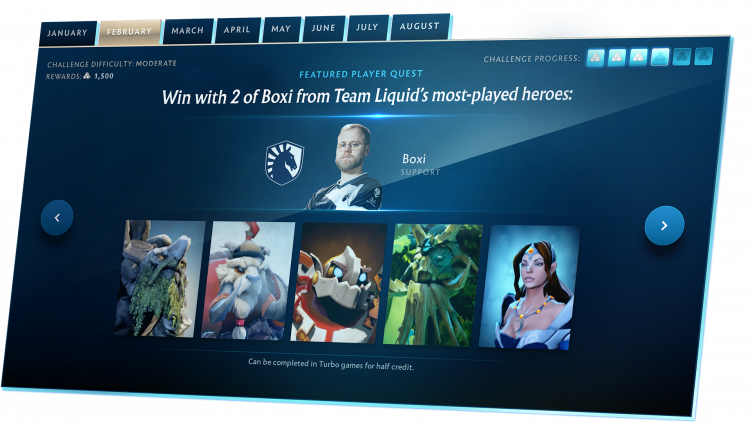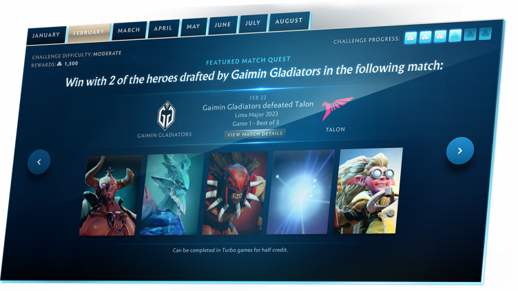 Вы наблюдали за профессионалами, болели за них... Теперь пора играть как они. Представьте, что вы оказались в геймерском кресле своего любимого киберспортсмена, и воссоздайте его достижения за прошедший год. Побеждайте за героев из конкретной игры или за тех, на ком конкретный профессионал играл чаще всего в течение месяца. Очки компендиума даются не только за отдельные задания, но и за выполнение всех испытаний, связанных с определённым месяцем.