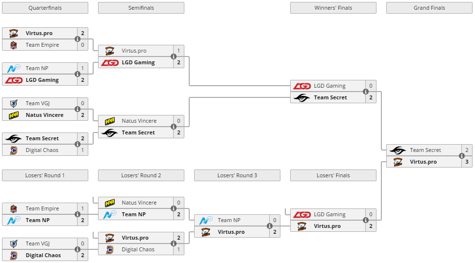 Илья "Lil" Ильюк, команда решила, что нужно уверенно завершить выступление на The Summit и выбрали своих привычных героев. Virtus.pro с уверенностью разобрались с Secret в финальной игре и стали двукратными чемпионами Summit.