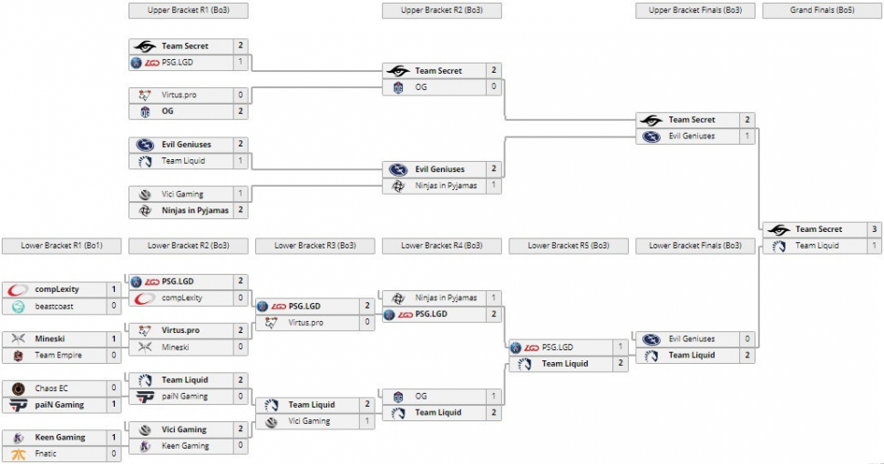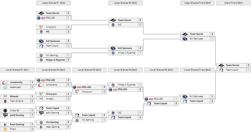 — Первый раунд нижней сетки best-of-1 (до одной победы), гранд-финал best-of-5 (до трех побед), все остальные матчи best-of-3 (до двух побед)