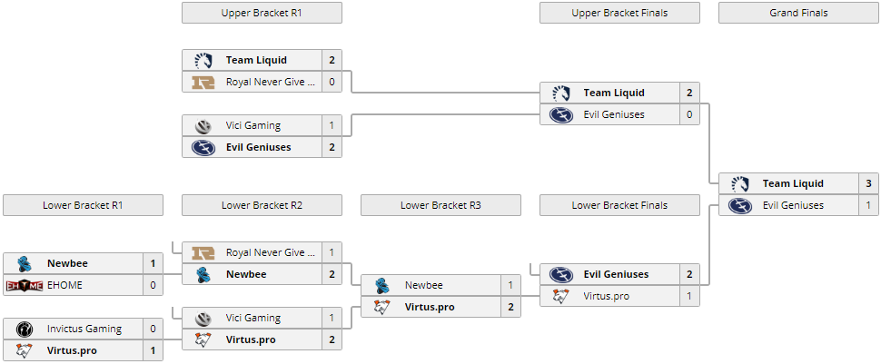 — Формат гранд-финала best-of-5 (до трех побед), первый раунд нижней сетки best-of-1 (до одной победы), все остальные матчи best-of-3 (до двух побед)