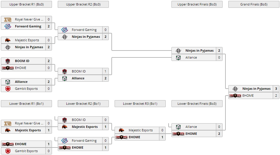 — Первые три раунда нижней сетки best-of-1 (до одной победы), гранд-финал best-of-5 (до трех побед), все остальные матчи best-of-3 (до двух побед)